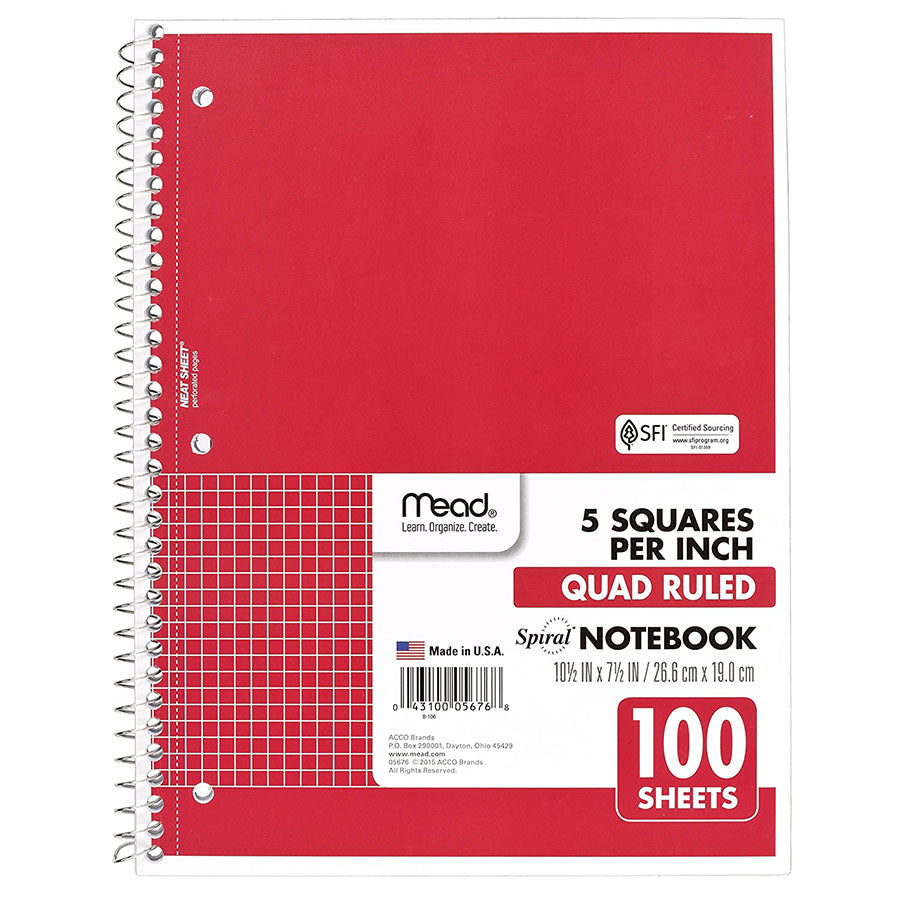 Mead Spiral Quad Notebook offers durable and convenient note-taking with 100 quad-ruled sheets. This notebook features a sturdy spiral binding and a perforated design for easy sheet removal. Ideal for math, science, and engineering courses, it provides ample space for detailed notes and diagrams.