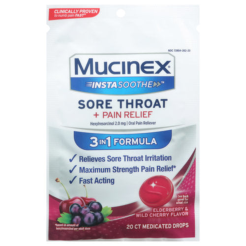 Mucinex Elderberry & Cherry Drops (20 count) provide soothing relief from cough and sore throat. These drops combine the power of elderberry with the soothing properties of cherry flavor, making them a pleasant way to ease discomfort. They are easy to carry and perfect for on-the-go relief.