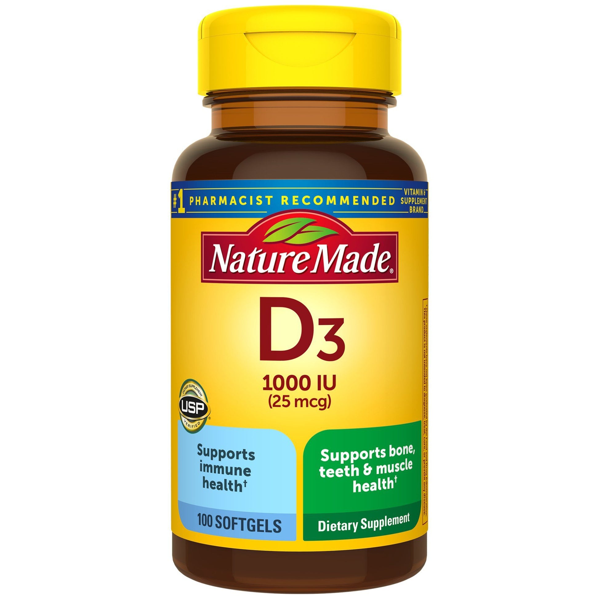 Support your bone and immune health with Nature Made Vitamin D3 Softgels. Each softgel contains 1000 IU of Vitamin D3, an essential nutrient for calcium absorption and overall wellness. With 100 softgels per bottle, this supplement offers a convenient way to maintain healthy vitamin D levels.