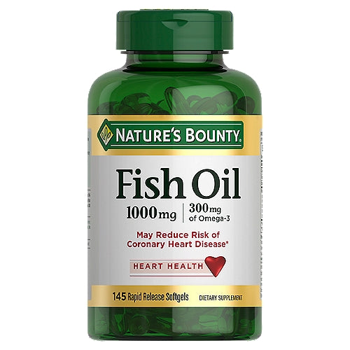 Nature's Bounty Fish Oil Softgels provide a rich source of omega-3 fatty acids for heart and overall health. The 145-count bottle contains 1000mg softgels that support cardiovascular health, joint function, and brain health. Perfect for daily use, they are an easy and convenient way to incorporate essential nutrients into your diet.