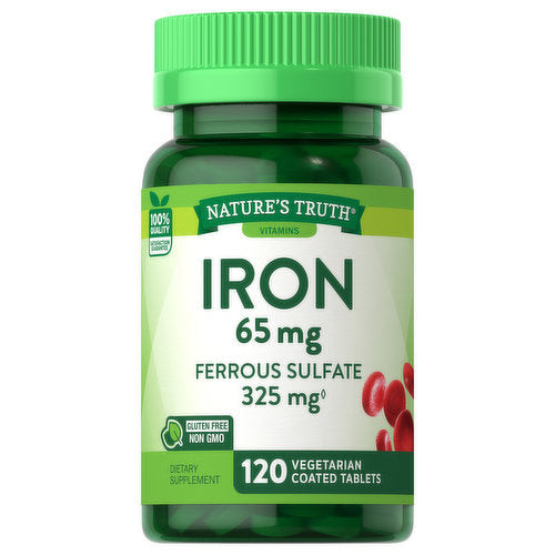 Nature's Truth Ferrous Sulfate Tablets provide a potent source of iron, essential for red blood cell production. This bottle contains 120 tablets, each with 65mg of ferrous sulfate, helping to prevent and treat iron deficiency anemia. Ideal for those with low iron levels, they support overall energy and vitality.