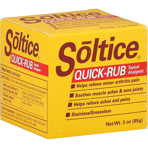 Solstice Quick-Rub provides soothing relief for muscle aches and pains. The 3oz tube contains a fast-acting formula that penetrates deeply to relieve soreness and stiffness. Perfect for use after exercise or physical activity, it helps relax muscles and improve recovery, promoting overall wellness and comfort.
