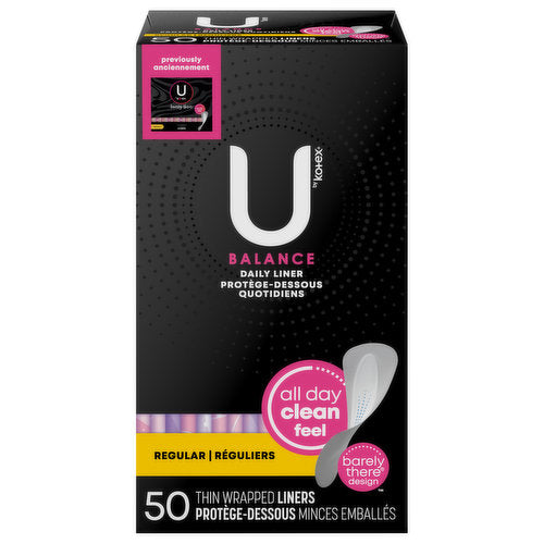 U by Kotex Barely There Liners offer discreet and comfortable protection for light days or daily freshness. The 50-count pack contains thin, flexible liners that fit seamlessly into your underwear, providing all-day comfort and confidence. Perfect for everyday use, they are designed to stay in place and keep you feeling clean and fresh.
